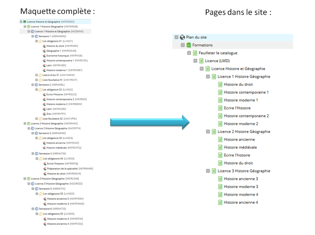 À gauche est affichée la structure de la maquette de formation et à droite est affichée les pages qui seront visibles dans le site.