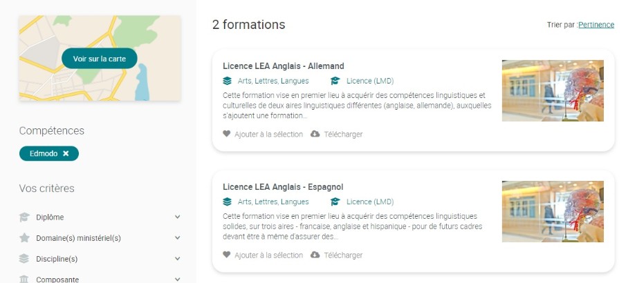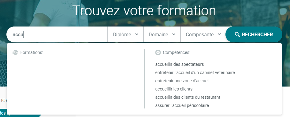 When you enter a text in the search box, the autocomplete function lists the associated skills. Clicking on a skill allows you to find the training course(s) with that skill.