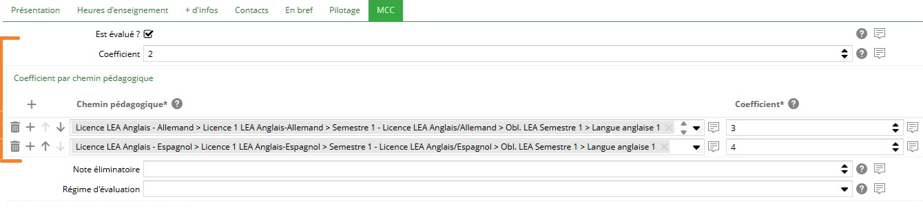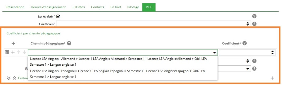 On the same principle, when an ELP is mutualized, a multiple "Coefficient per learning path" field is present in the MCC tab, allowing you to define a specific coefficient value per learning path.