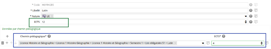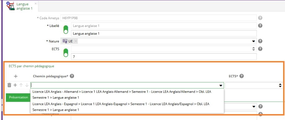 When an ELP is shared, a multiple "ECTS per learning path" field is present, allowing you to define a specific ECTS value per learning path.
