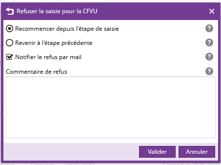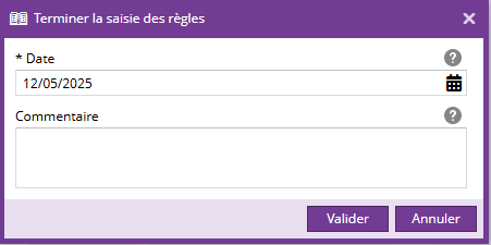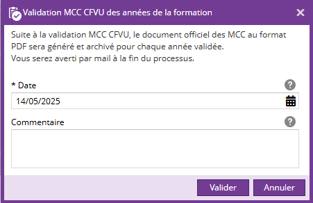 A pop-up window appears, allowing you to enter the validation date (mandatory) and a comment (optional).