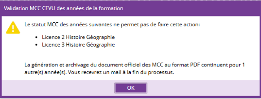 If one or more years do not allow global validation, an error message appears and the official MCC document is generated only for the valid year(s).