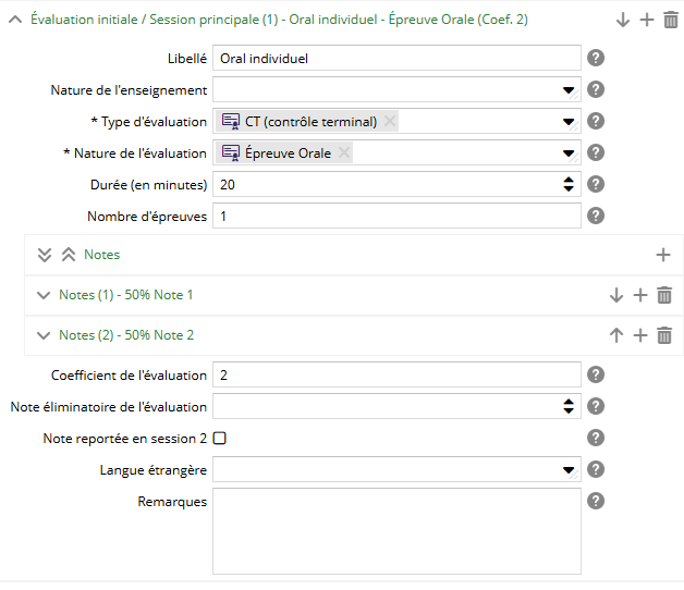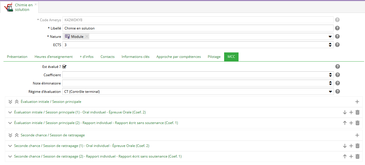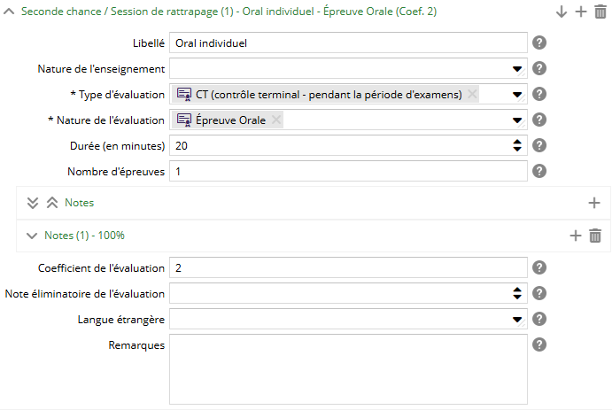 Un ELP peut contenir plusieurs évaluations de seconde chance / session de rattrapage. Les champs sont les mêmes que ceux de la session principale.