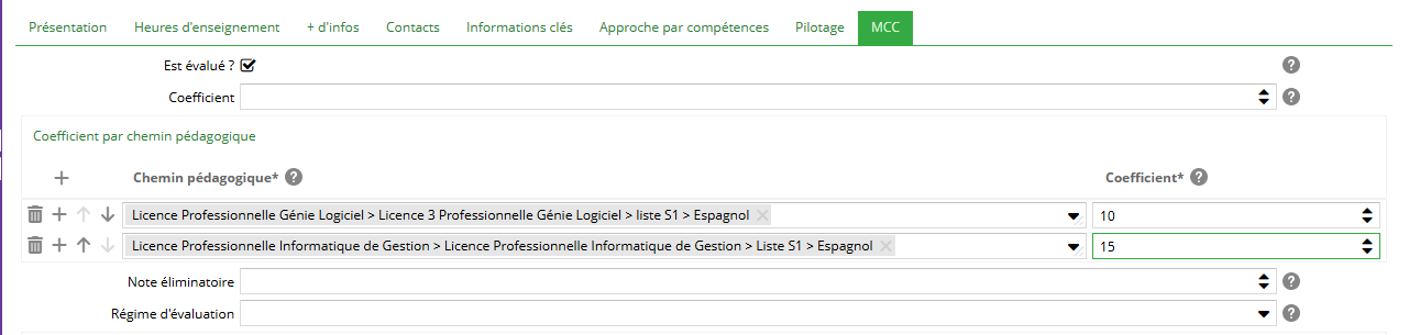 Ce champ est disponible uniquement pour les ELP mutualisés. Si un coefficient spécifique doit être défini sur un chemin pédagogique, une ligne sera ajoutée en renseignant :