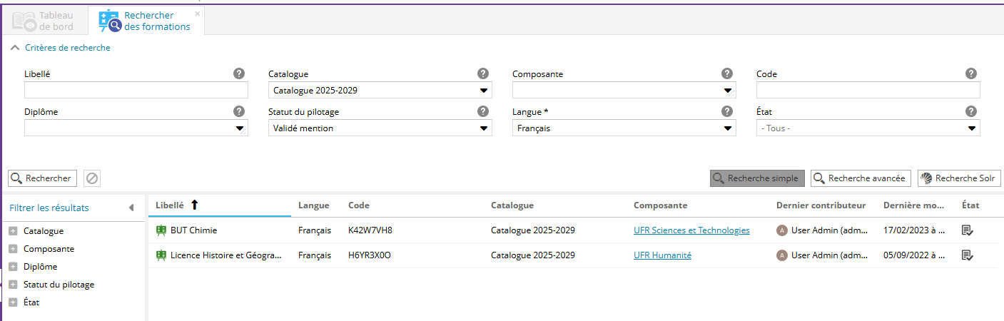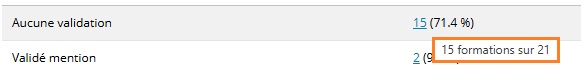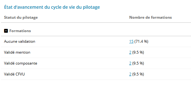 Au clic sur un chiffre souligné, une recherche sur les formations , dans cet état (dans cet exemple, le statut du pilotage est filtré sur "Validé mention") est ouverte dans un nouvel onglet :