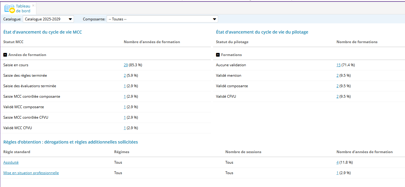 Le tableau de bord du pilotage affiche les statistiques relatives au cycle de vie pilotage, au cycle de vie MCC et aux règles d'obtention du diplôme.