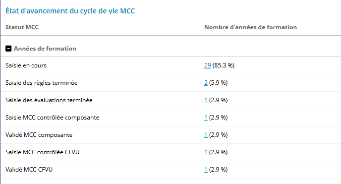État d'avancement du cycle de vie MCC : pour chaque statut du cycle de vie MCC, le nombre d'années de formation dans cet état est affiché.