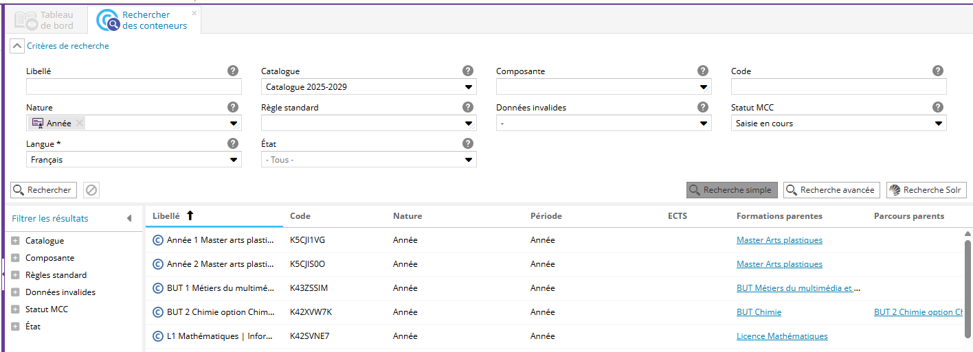 Au clic sur un chiffre souligné, une recherche sur les conteneurs de type année, dans cet état (dans cet exemple, le critère statut MCC est filtré sur "Saisie en cours") est ouverte dans un nouvel onglet :