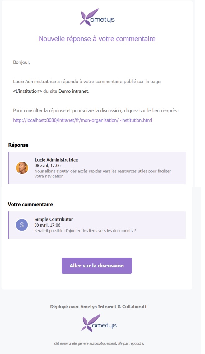 Lorsqu’une réponse est apportée à un commentaire sur le front office, son auteur est automatiquement notifié par email.