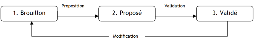 Le cycle de vie peut être modifié lors des spécifications et de la mise en place de l'application. En général il est composé des états "Brouillon, Proposé, Validé" mais ce n'est pas obligatoire.