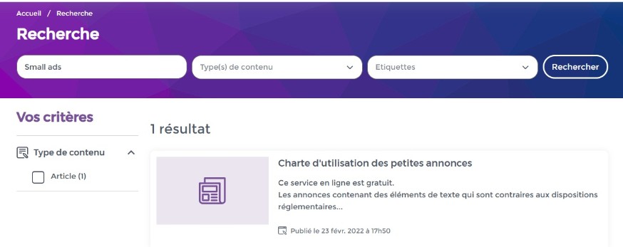 Dans l'exemple ci-dessous, la recherche est effectuée sur le mot "Small ads", la recherche sémantique trouve le mot "Petite annonce" car il possède le même sens que "Small ads".