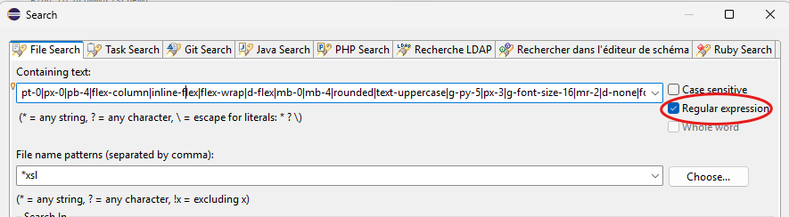 Voici un exemple de recherche à faire dans Eclipse en activant la case "Regular expression":