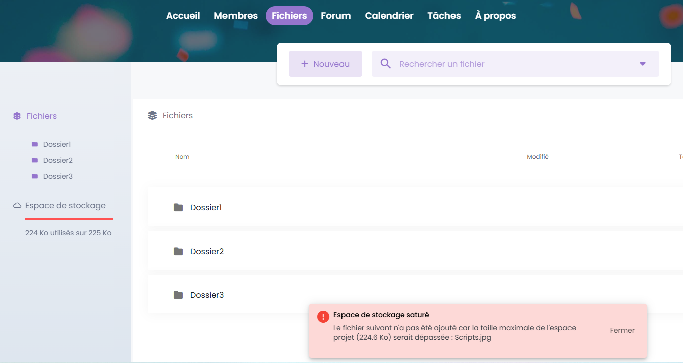 S'il n'y a pas assez de place pour ajouter un nouveau fichier, un message est affiché à l'utilisateur :