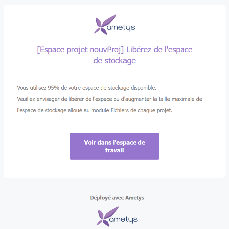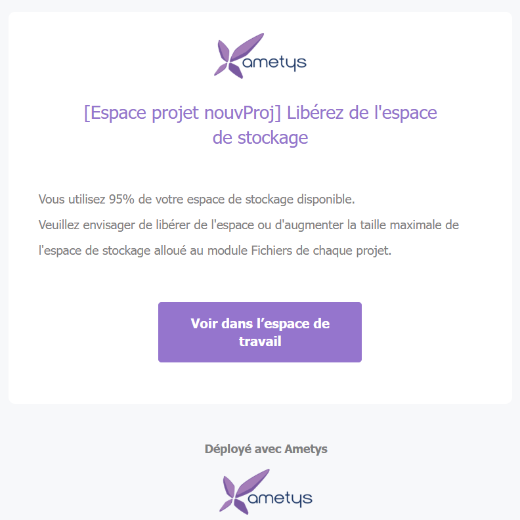Un mail est envoyé au responsable du projet lorsque l'espace est rempli à 95% pour le prévenir :